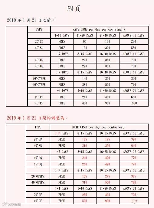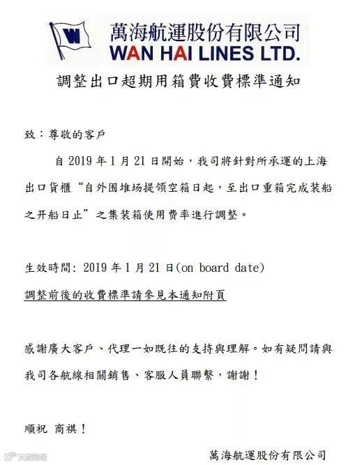 自2019年1月21日开始,将针对所承运的上海出口貨柜“自外围堆场提领空箱日起,至出口重箱完成装船之开船日止”之集装箱使用费率进行调整。