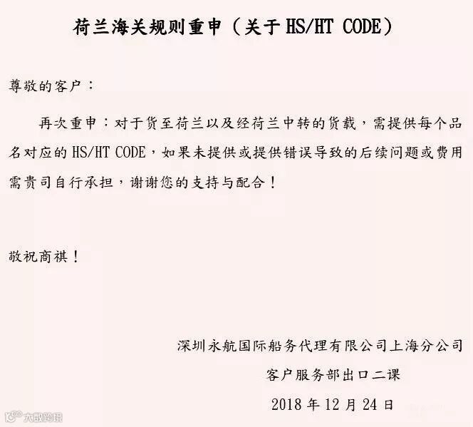 特别提醒:对于货至荷兰以及经荷兰中转的货载,每个品名都须提供对应的HS/HT CODE,且必须在品名栏与品名一一对应。如果未提供或提供错误导致的后续问题或费用需贵司自行承担。