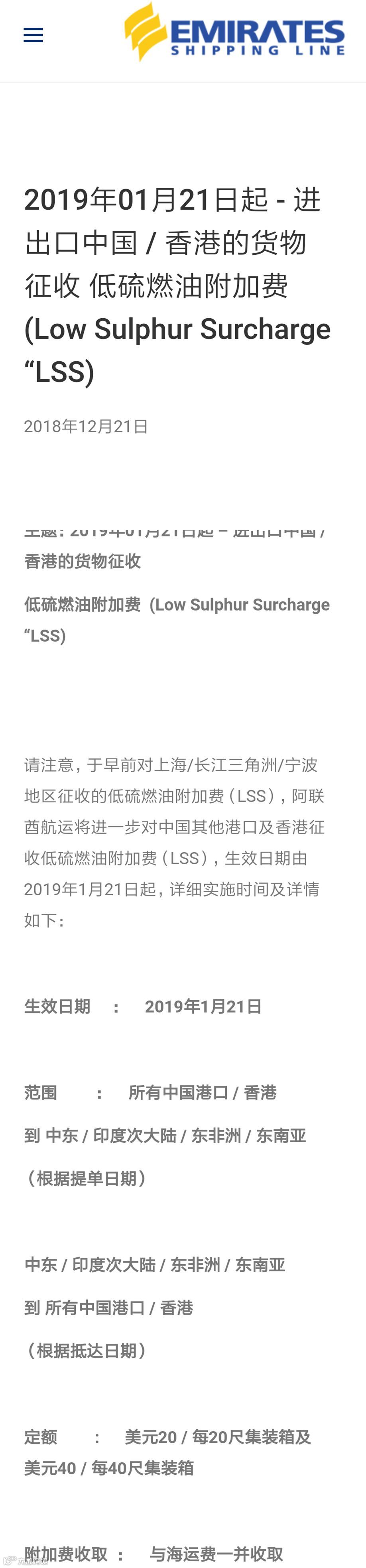 请注意,于早前对上海/长江三角洲/宁波地区征收的低硫燃油附加费(LSS),阿联酋航运将进一步对中国其他港口及香港征收低硫燃油附加费(LSS),生效日期由2019年1月21日起,详细实施时间及详情如下: