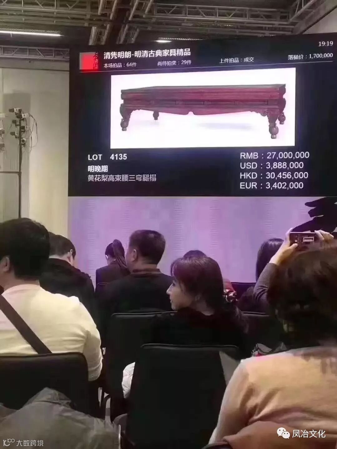 目前嘉德官网尚未公布拍卖结果。据在现场的木友传回的照片显示,专场上【明末清初黄花梨有束腰马蹄足三屏风独板围子罗汉床】落锤价1200万人民币,含佣金1380万: