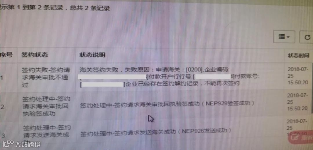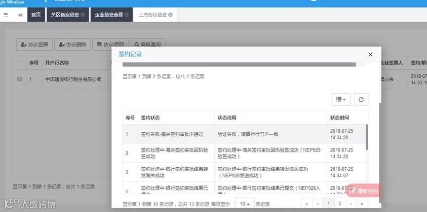 出现上图中的错误提示时,可能是由于企业的海关十位做了更改,导致之前签约成功的协议查不到,所以再次签约海关就会提示已签约,请联系海关。