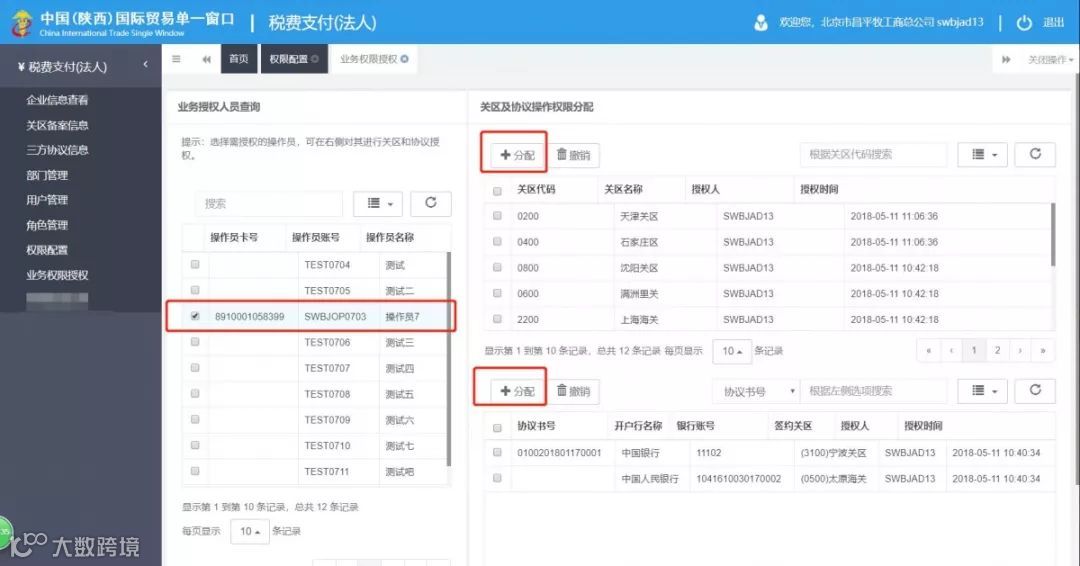 上一步确认没有勾选后进入到“业务权限授权”,给有卡操作员分配可操作的关区和协议,操作员只能看到已分配的关区下的税单数据和已分配的三方协议