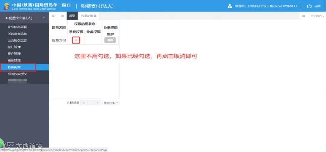 答:用户权限功能新上线,很多用户不了解如何使用,如果之前的功能已经能满足业务需求,那么是用不到这个新功能的,这里就不需使用“权限设置”。如下图所示,我们默认是不勾选这个选项的,如下图。(如果有启用的需求请详细阅读《中国国际贸易“单一窗口”标准版用户手册(税费支付)》文档中4到8章进行相关配置)
