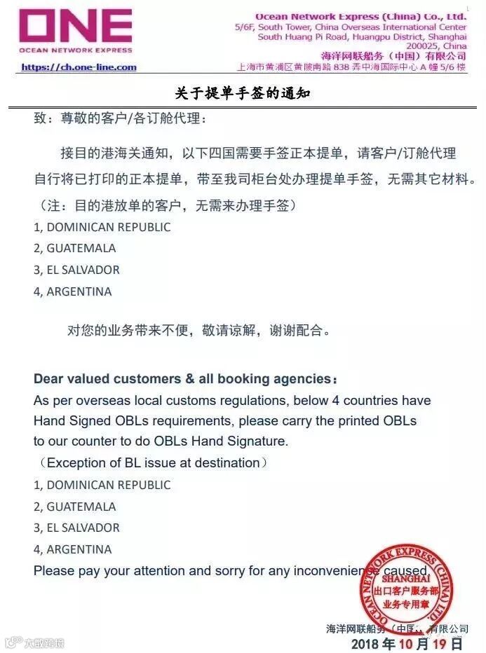 尊敬的客户/各订舱代理: 接目的港海关通知,DOMINICAN REPUBLIC、GUATEMALA、EL SALVADOR、ARGENTINA四国需要手签正本提单,请客户/订舱代理自行将已打印的正本提单,带至我司柜台处办理提单手签,无需其它材料。