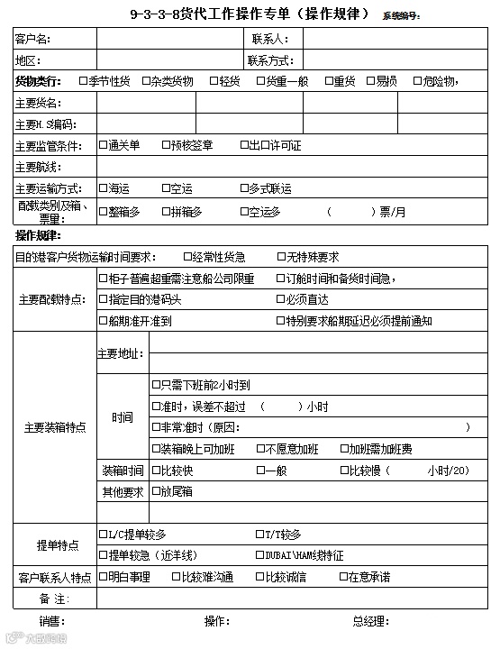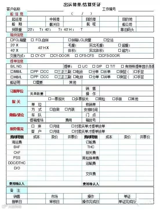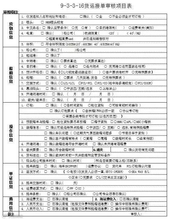 另外一方面这类表单项目内容也是货代的具体工作内容,希望通过这种方式,可以让相关人员了解货代的业务运作机制,尤其是大量二代的工作性质。一代有关订舱流程、开箱单、舱单数据处理等未列入表中。
