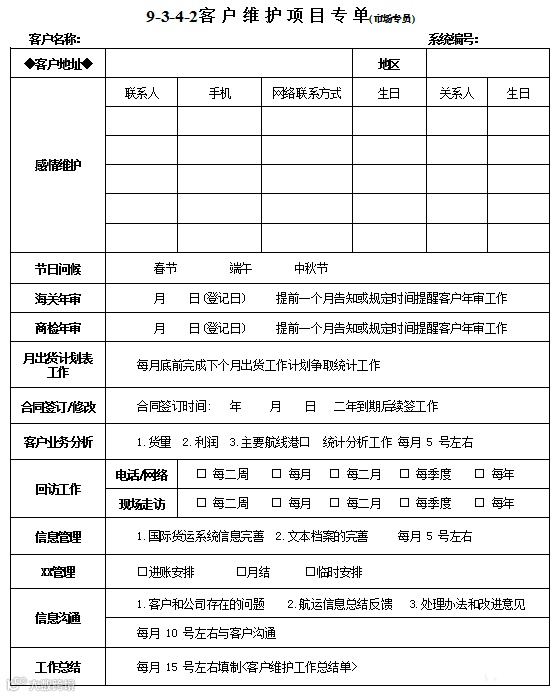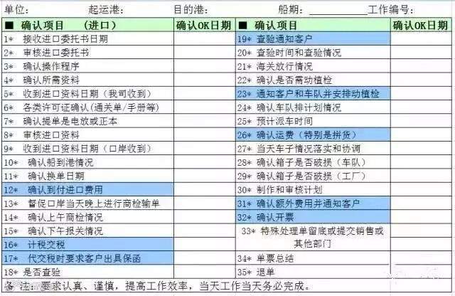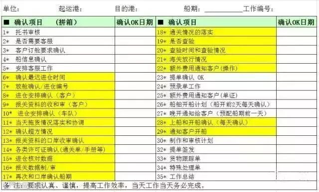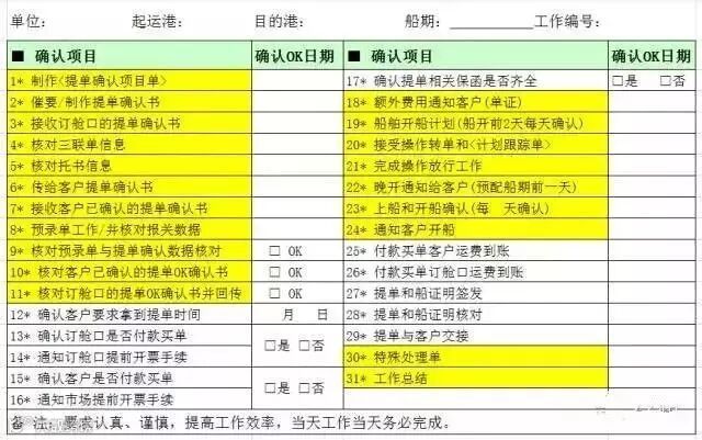 此类表单用于货代工作人员对业务流程关键点的监控,尤其对于货代新手,有一定的学习和参考价值。表格中有些流程需要根据情况加以调整,譬如报关资料及三联单已经无纸化流程需要进一步调整。