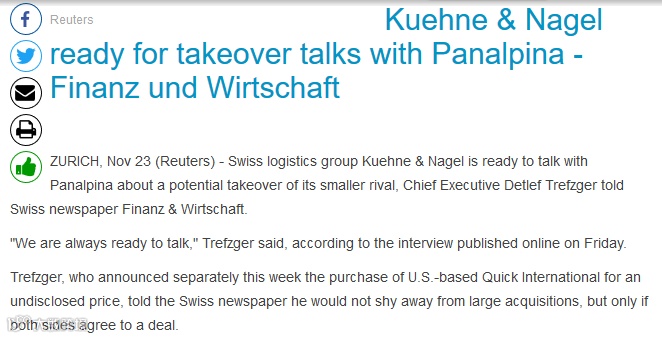 Reuters reports: “Swiss logistics group Kuehne & Nagel is ready to talk with Panalpina (PWTN.S) about a potential takeover of its smaller rival, Chief Executive Detlef Trefzger told Swiss newspaper Finanz & Wirtschaft.”