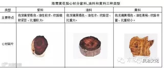 △海南黄花梨心材分紫料、油料和黄料三种类型