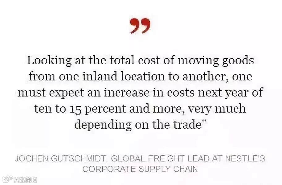雀巢全球供应链货运主管Jochen Gutschmidt解释说:“虽然年度成本增加正常估计范围在3%或4%,但在某些行业,明年可能会增加10%到15%,所有运输包括海洋运输,端到端的流程其他成本要素的增加。”