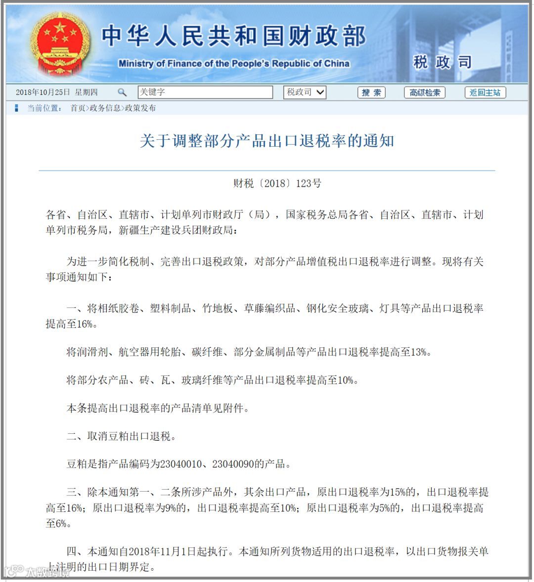 通知明确,本通知自2018年11月1日起执行。本通知所列货物适用的出口退税率,以出口货物报关单上注明的出口日期界定。
