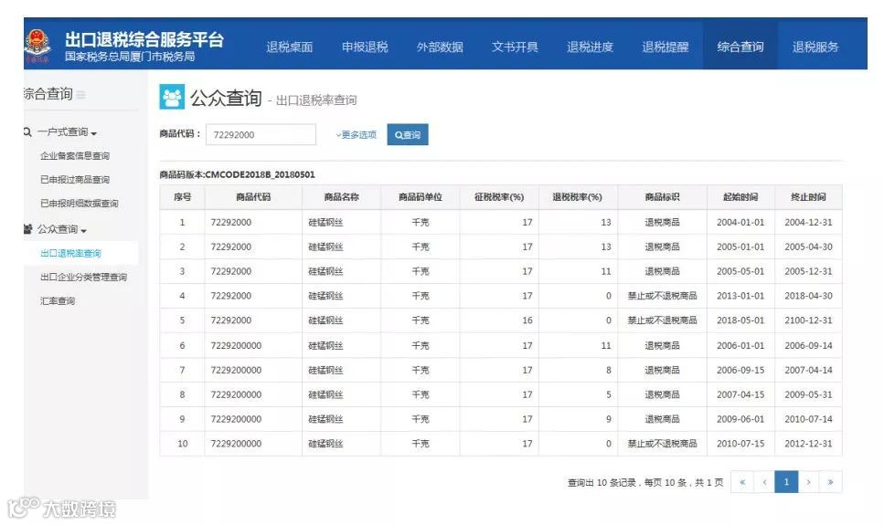 ②点击“综合查询”——“公众查询”——“出口退税率查询”,输入商品代码,点击“查询”
