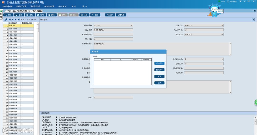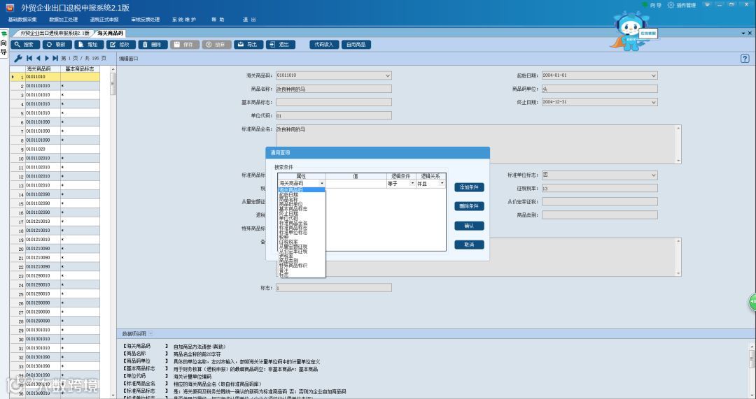 ③“属性”下拉框中有多种选项,以选择“海关商品码”为例,点击后,第二框“值”处可填入要查询的海关商品码,确定“逻辑条件”、“逻辑关系”,点击“确定”即可。