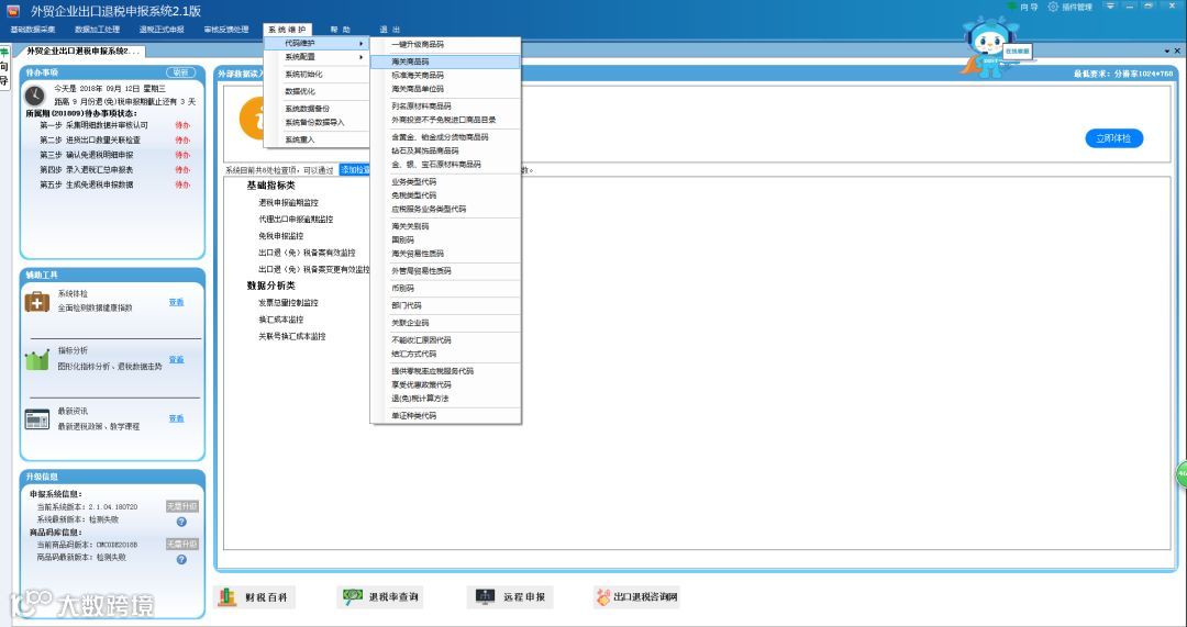 ①登录系统,点击“系统维护”——“海关商品码”。