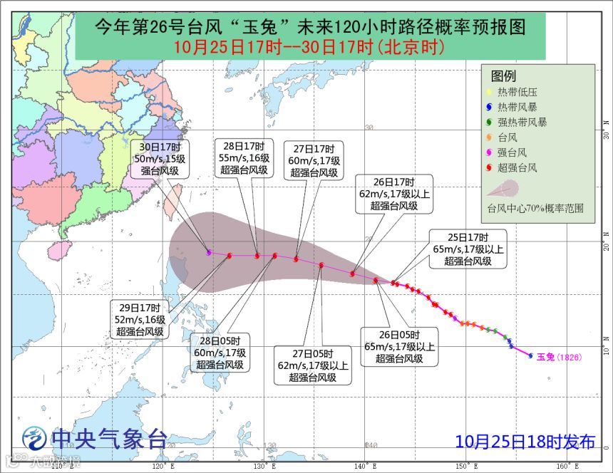 今年第26号台风(超强台风级)“玉兔”的中心,25日下午5点钟位于美国关岛西北方约365公里的西北太平洋洋面上,就是北纬16.1度、东经142.8度,中心附近最大风力17级以上(65米/秒),中心最低气压910百帕,七级风圈半径380-400公里,十级风圈半径120-140公里,十二级风圈半径80公里。