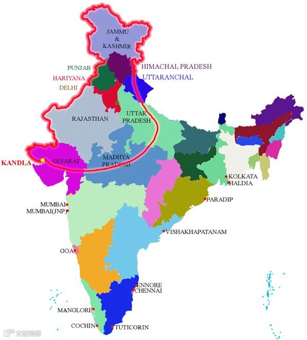 印度是南亚次大陆最大的国家,国内港口众多,主要港口有12个,包括孟买、加尔各答、钦奈(原名马德拉斯)、科钦、果阿等,承担3/4货运量。其中,孟买港为最大港口,海运能力居世界第18位。
