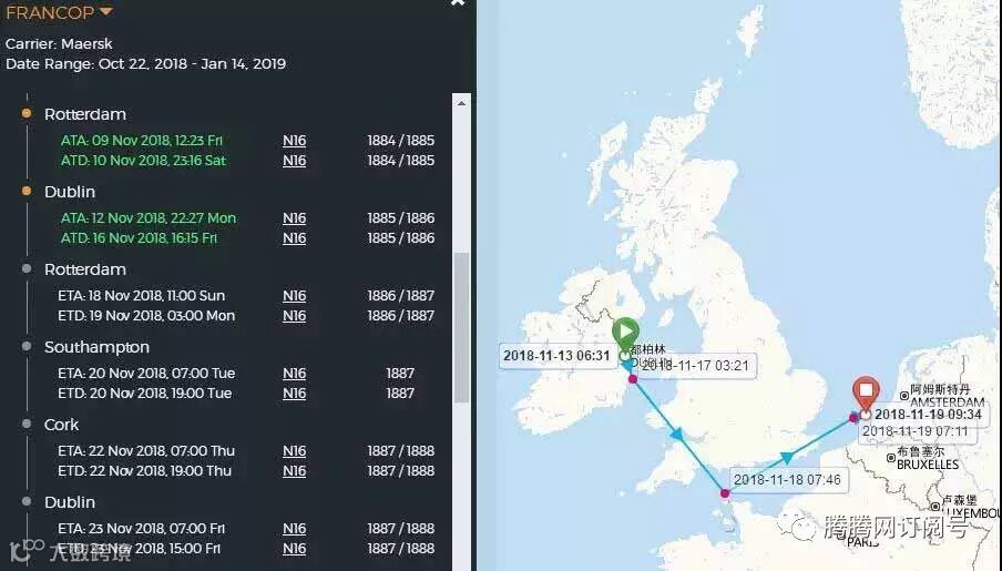 据大船期资料显示,这艘集装箱船是一艘往返于鹿特丹、都柏林、南安普顿、利物浦港口的公共驳船,服务的船公司有Maersk、CMA-CGM、Hapag-Lloyd、APL、MCC等9家船公司。