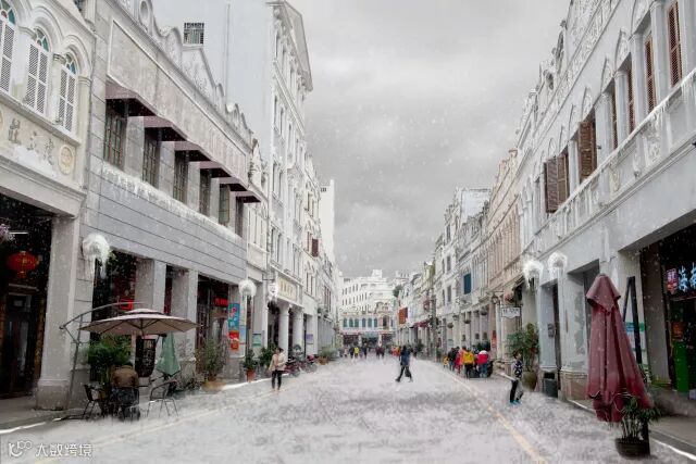 别人家的古董按件算,海口人民的古董按“栋”算!!!海口骑楼老街,是海口市一处最具特色的街道景观。其中最古老的建筑四牌楼建于南宋,至今有700多年历史。骑楼大多是上世纪初一批批从南洋回来的华侨借鉴当时的南洋建筑风格所建。骑楼大多布满优雅细致的雕塑和洋派的装饰,很有些巴洛克的味道。骑楼楼层都不太高,两三层的居多,有些还保留着早前的商号,和凭栏、门窗等处的精美雕花。在雪景的承托下老街另显一翻风格。