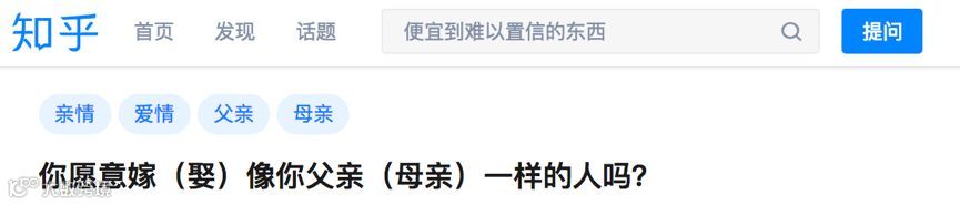 在知乎上有两个父女类的话题讨论度很高,一个是:“你愿意嫁像你父亲一样的人吗?”,另一个是“父亲的言谈举止是不是直接决定了女儿未来的择偶标准?”