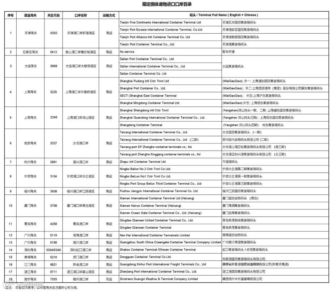 ▼限定固体废物进口口岸目录