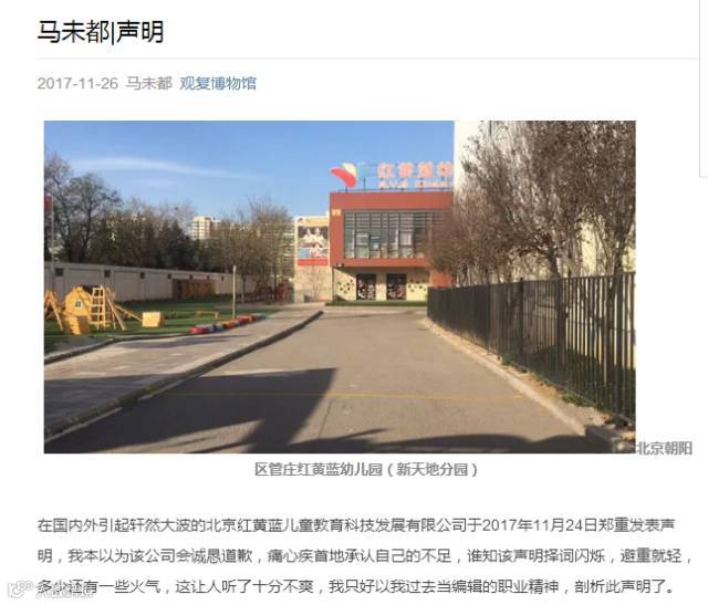 收藏家马未都撰文剖析解读了红黄蓝幼儿园的声明,称:非常气愤,不吐不快,上市大公司发生问题不诚恳,耍文字滑头,让人无法接受。