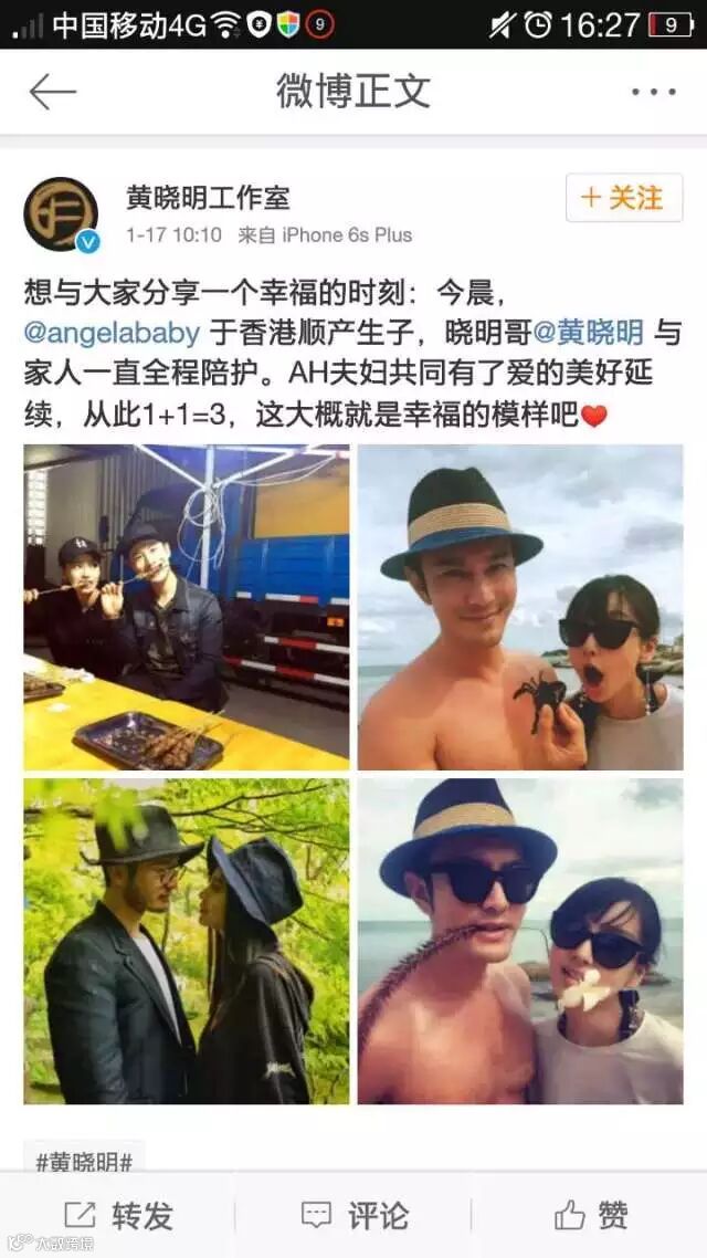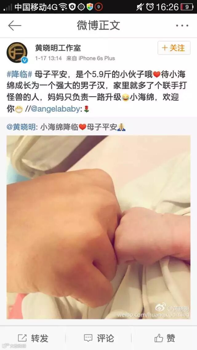 黄晓明工作室、杨颖工作室也发文祝贺,称“想与大家分享一个幸福的时刻:今晨,@angelababy 于香港顺产生子,晓明哥@黄晓明与家人一直全程陪护。AH夫妇共同有了爱的美好延续,从此1+1=3,这大概就是幸福的模样吧”。