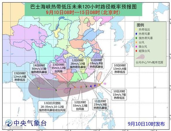根据中央气象台的消息,巴士海峡热带低压于今天(10日)上午8点钟生成,其中心位于海南省文昌市以东大约1180公里的海面上,就是北纬21.6度、东经121.9度,中心附近最大风力有6级(13米/秒),中心最低气压为1002百帕。