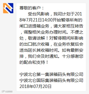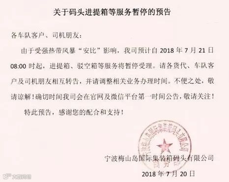 宁波梅山岛国际集装箱码头(梅山码头)发出通知,自2018年7月21日8时起,提进箱、驳空箱等服务将暂停受理。