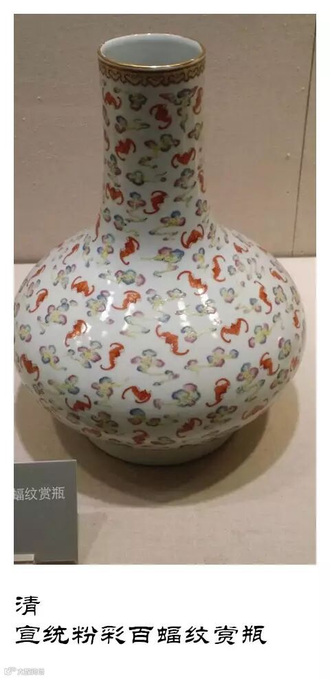 束颈敞口,肩起弦纹两道,腹部扁圆,是标准的赏瓶造型。瓶口、肩及胫部分别装饰以如意云、宝相花及莲瓣纹,百蝠纹作主题纹饰,色彩艳丽。画法工整。官窑。 白釉底,书红彩“大清宣统年制”二行六字楷书款。