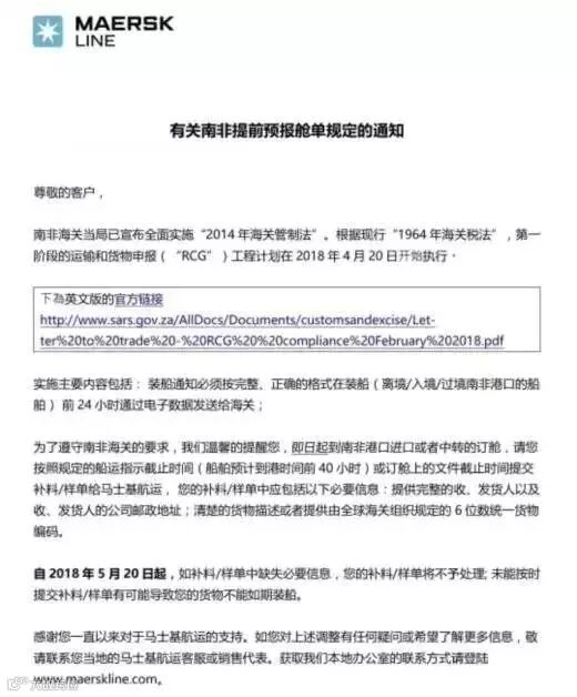 实施主要内容包括装船通知必须按完整、正确的格式在装船(离境/入境/过境南非港口的船舶)前24小时通过电子数据发送给南非海关。