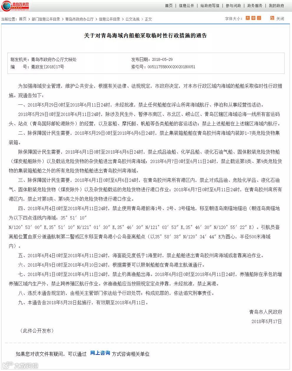 山东省青岛市政府发布关于对青岛海域内船舶采取临时性行政措施的通告。5月29日至6月11日,未经批准禁止任何船舶在浮山所湾海域航行、停泊和从事经营性活动。