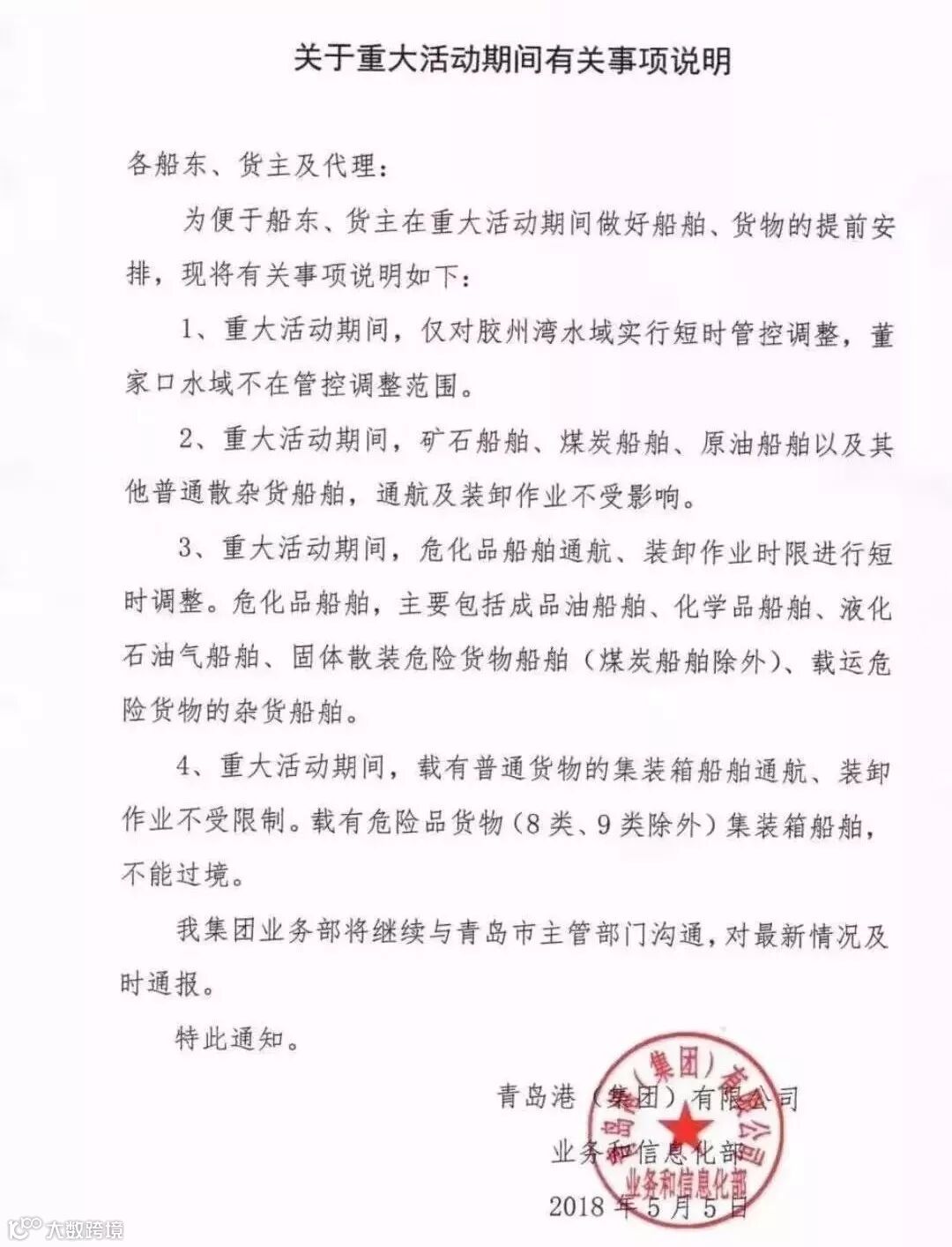 此前,青岛港也发布了“关于重大活动期间有关事项说明”。