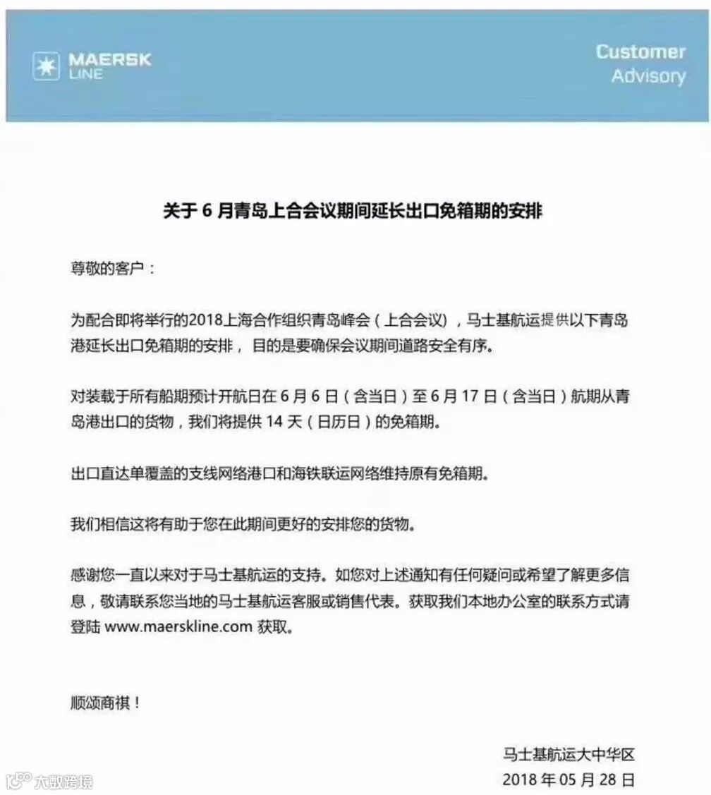 同时马士基发布关于上合会议期间延长出口免箱期安排的通知。