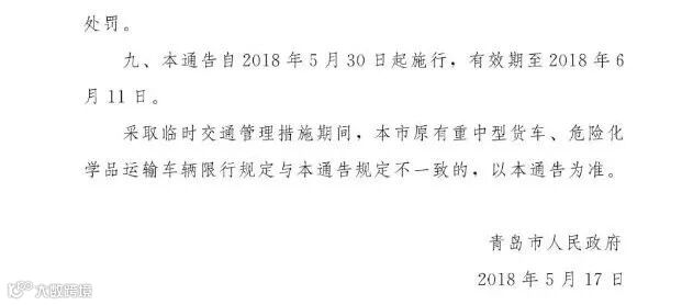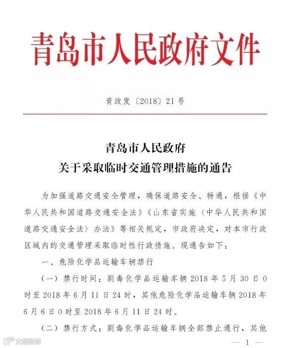 2018年6月7日0时至6月11日24时,禁止载运第8类、第9类危险货物的集装箱船舶之外的所有危险货物船舶进出青岛胶州湾海域。