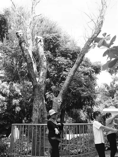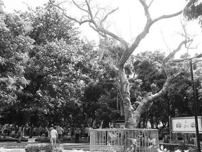 去年9月7日,公园工作人员发现其中一株花梨树的枝干上有多处树皮腐烂脱落,树枝已枯死。该枝条直径约12米,长约10米。为确保市民游客的安全,公园管理处在请示海口市园林局后及时进行修理,锯除枯枝,并送至园林局存放。