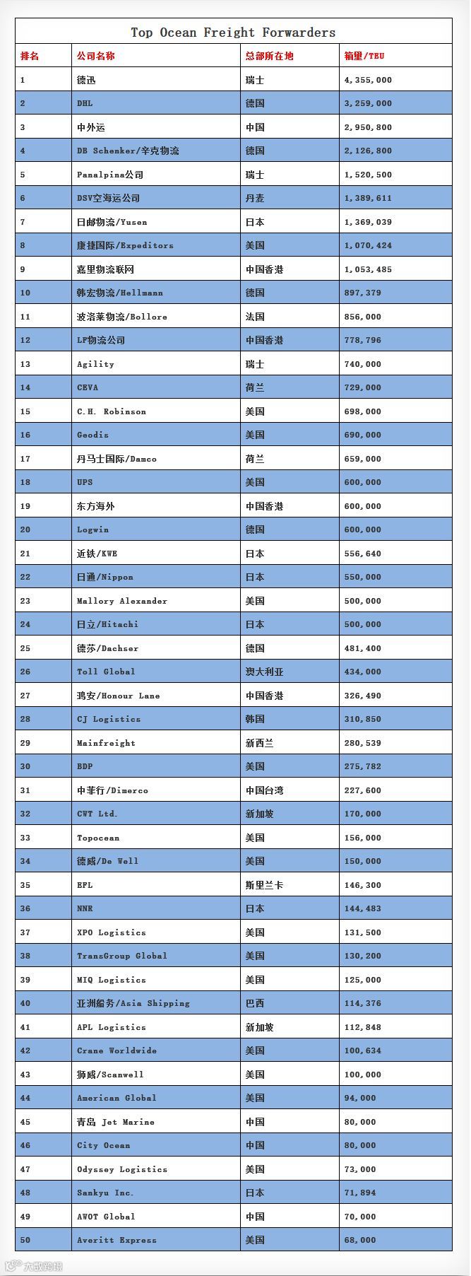 日前物流业权威杂志《Transport Topics》公布了2018全球货代50强榜单!瑞士的德迅公司以年处理箱量435.5万TEU排行第一;德国DHL以年处理箱量325.9万TEU紧随其后;中国外运以年处理箱量295.08万TEU位列中国公司之首,国际排名第三。