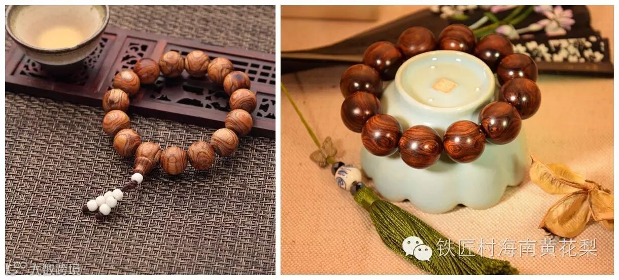 黄花梨的底色为黄红褐色为多,紫、黑色料极为稀缺。整体颜色不单一,变化大。体现在珠子上的颜色由深慢慢过渡到浅再到深。且往往是几种颜色交错相融,给人感觉色泽丰富,就是说不出整体什么颜色那种感觉,在不同光线下体现的主色也有所差异。