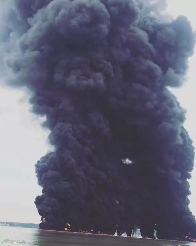 漏油在水面上燃烧导致浓烟滚滚