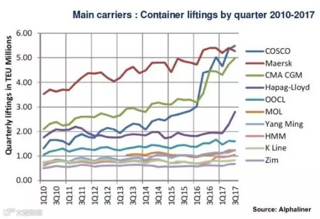 由于中远海运加上收购的OOCL(第三季度为160万TEU),Alphaliner预测,2018年中远海运或将在稳定集装箱运输量第一的位置。