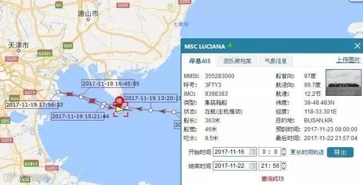 事发时“MSC LUCIANA”刚挂靠完天津港前往釜山,在离开天津两三个小时后与苏连海机0118相撞。