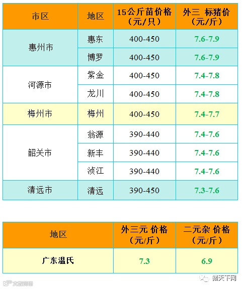 有红绿颜色部分是相对昨天有所变动的猪价;