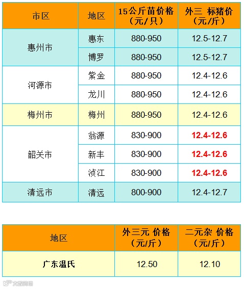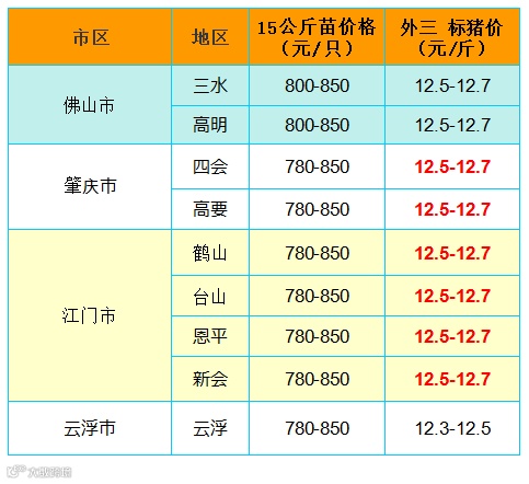 有红绿颜色部分是相对昨天有所变动的猪价;
