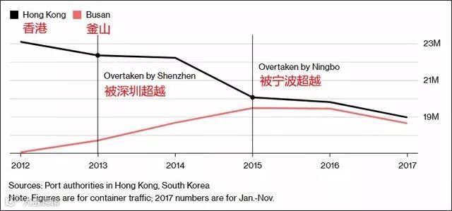 报道称,在全球集装箱港排名上,十年来,香港一直稳步下滑。2005年将全球最大货柜港的地位让给了新加坡,2007年将第二大港的地位让给了上海,2013年又被深圳夺取了第三名,2015年则是将第四名的位置让给了宁波。2016年,香港首次跌出2000万箱俱乐部,今年数据有所回升,但总体仍不乐观。而2018年,其第5的位置极有可能被釜山夺走。