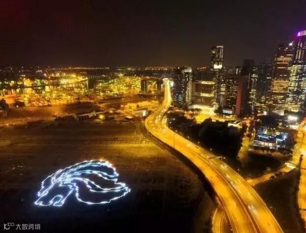 在夜幕低垂,一个巨型狮头标志瞬间亮起,连同周围商业区的高楼大厦形成迷人夜景。