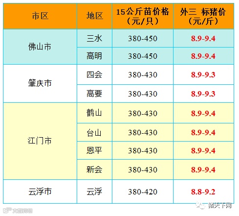 有红绿颜色部分是相对昨天有所变动的猪价;
