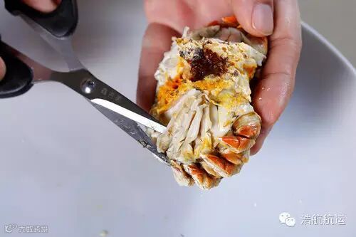 第九步:将蟹钳分成三段,前两段都可将蟹壳直接剪开,用勺舀出肉。