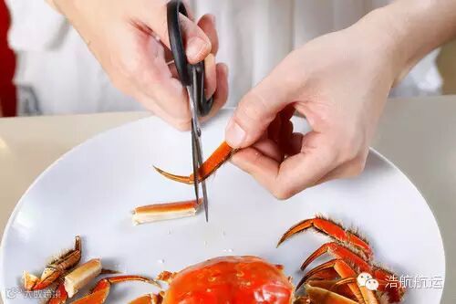 第七步:用剪刀把蟹腿剪成三截,最末一截蟹脚尖可充当工具。