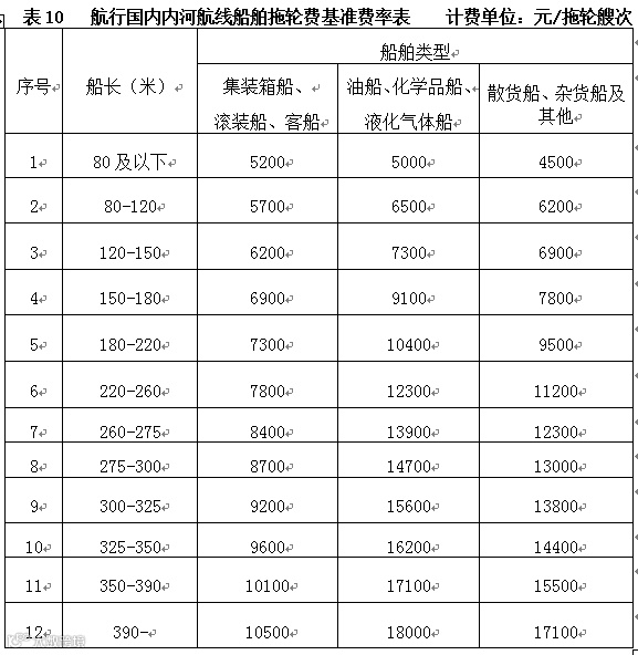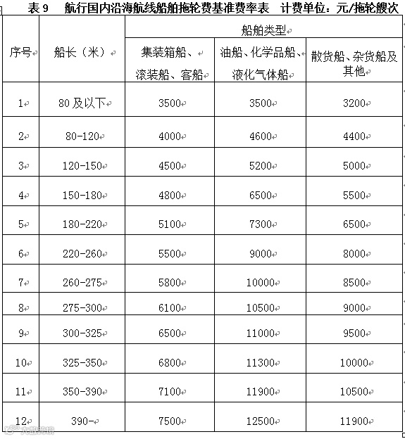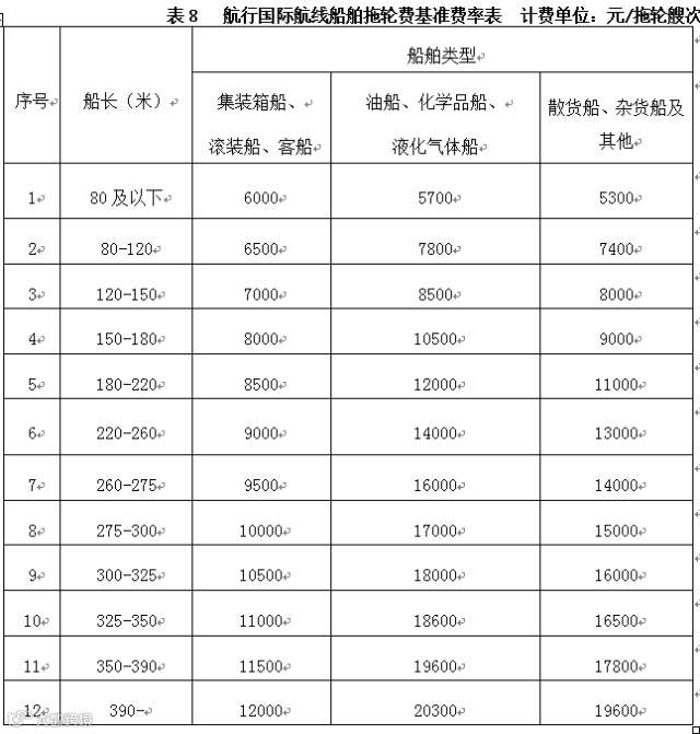第二十五条船舶靠离泊使用拖轮和引航或移泊使用拖轮,提供拖轮服务的单位向船方或其代理人计收拖轮费。航行国际、国内航线船舶每拖轮艘次费率分别按表8(航行国际航线船舶拖轮费基准费率表)、表9(航行国内沿海航线船舶拖轮费基准费率表)和表10(航行国内内河航线船舶拖轮费基准费率表)规定计收。
