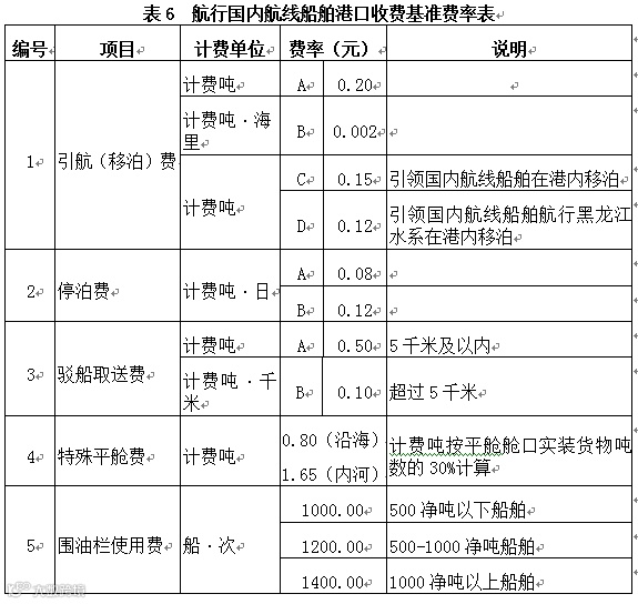 第三十八条航行国内航线船舶的特殊平舱费、围油栏使用费,分别按表6 (航行国内航线船舶港口收费基准费率表)编号4、编号5规定费率计收。