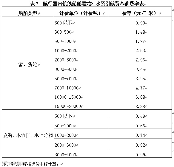 第二十条引领国内航线船舶航行黑龙江水系,引航费按表7(航行国内航线船舶黑龙江水系引航费基准费率表)规定费率计收,20000计费吨以上船舶和4000计费吨以上由拖轮拖带驳船、木竹排、水上浮物的引航费收费标准由引航机构与船方或其代理人协商确定;港内移泊费按表6 (航行国内航线船舶港口收费基准费率表)编号1(D)规定费率按次计收。