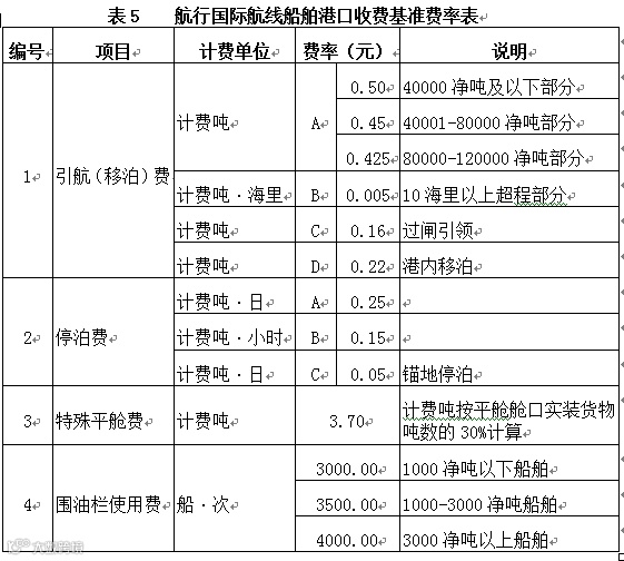 第三十六条航行国际航线船舶的特殊平舱费、围油栏使用费,分别按表5 (航行国际航线船舶港口收费基准费率表)编号3、编号4规定费率计收。